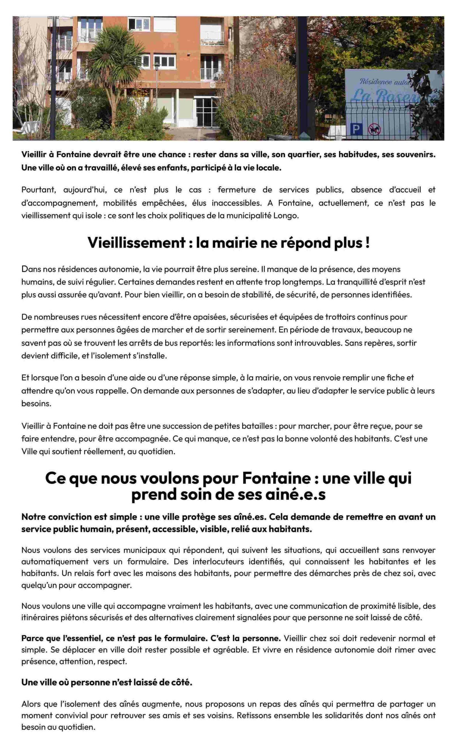 Pourtant, aujourd’hui, ce n’est plus le cas : fermeture de services publics, absence d’accueil et d’accompagnement, mobilités empêchées, élus inaccessibles. A Fontaine, actuellement, ce n’est pas le vieillissement qui isole : ce sont les choix politiques de la municipalité Longo.