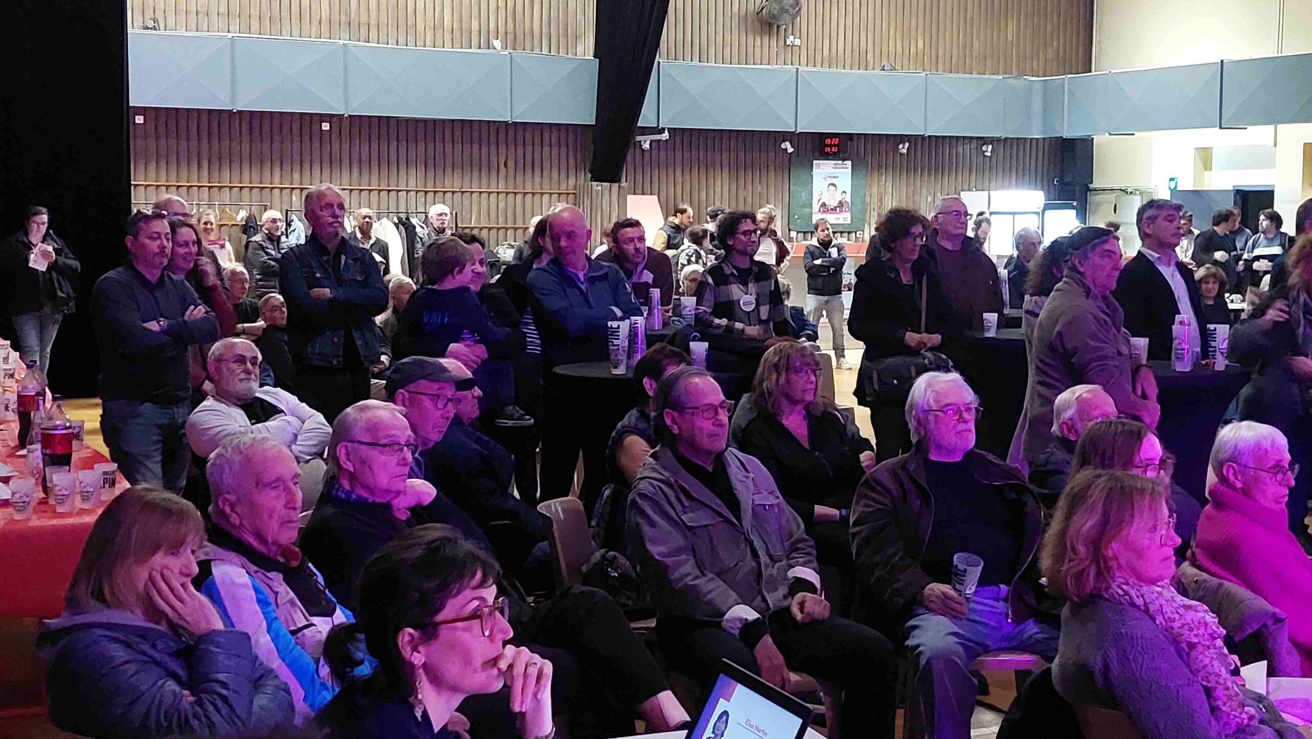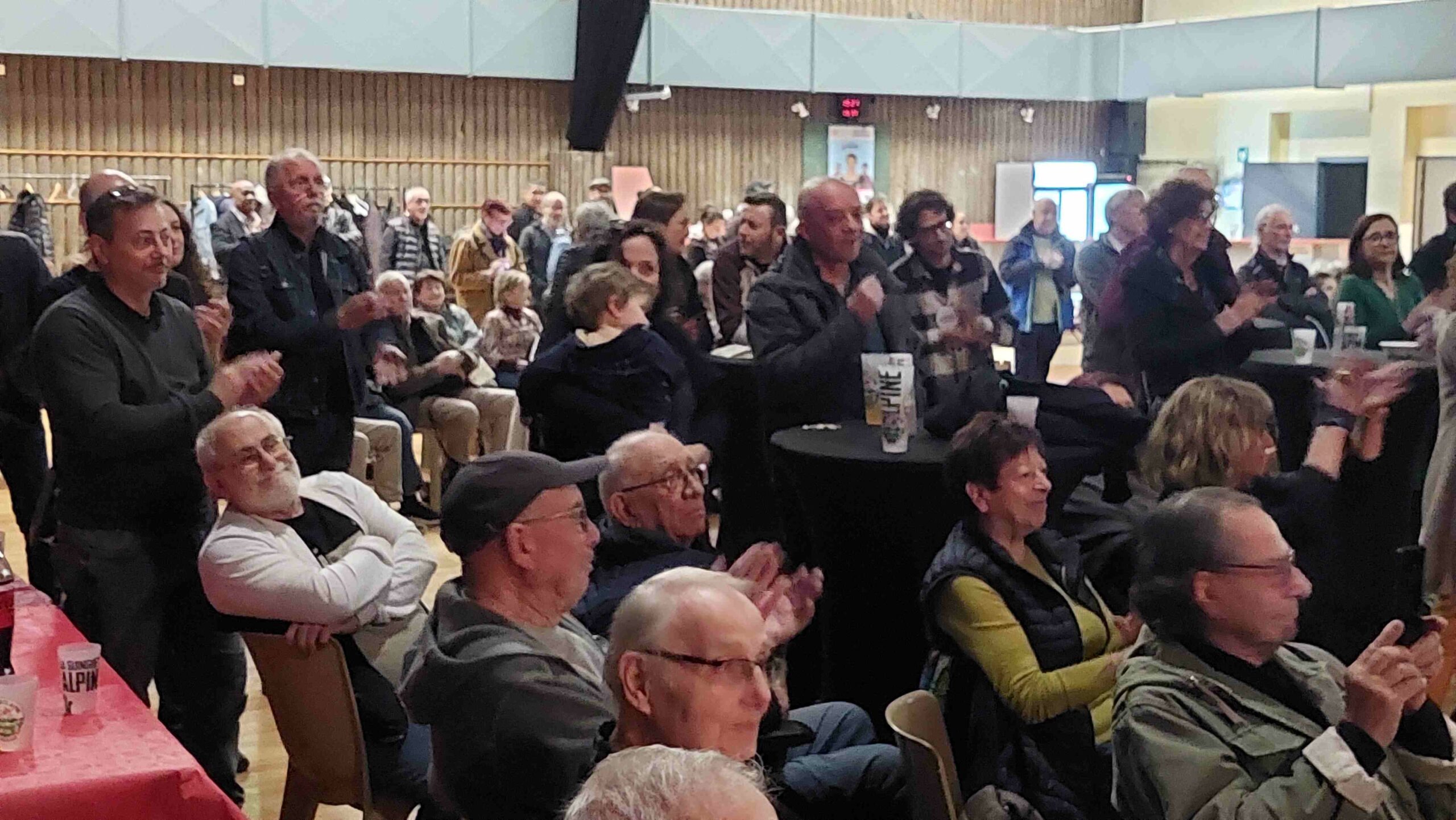 Plus de 200 personnes se sont réunies à la salle Edmond Vigne qui avait été génialement aménagée pour l’occasion en plusieurs espaces conviviaux avec scène, écran, places debout et assises, tables pour se procurer de la documentation (programme, tracts…), pour des jeux pour les enfants ou encore pour se restaurer.
