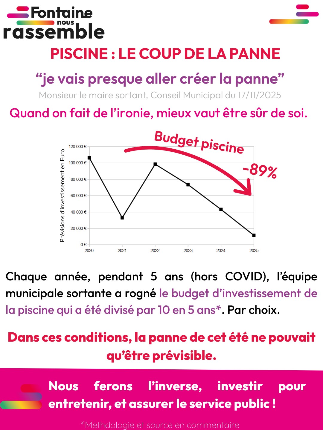 Chaque année pendant 5 ans, (hors COVID) l’équipe municipale sortante a rogné le budget d’investissement de la piscine qui a été divisé par 10 en 5 ans.