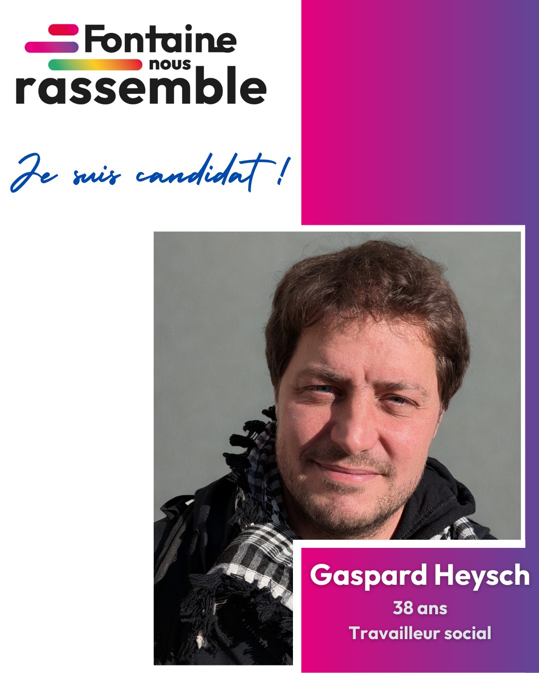 « Éducateur spécialisé dans un centre de santé et militant pendant 10 ans dans une association antiraciste, j’ai choisi d’agir avec la liste « Fontaine nous rassemble » car je pense qu’il est urgent de se mobiliser sur le terrain politique.